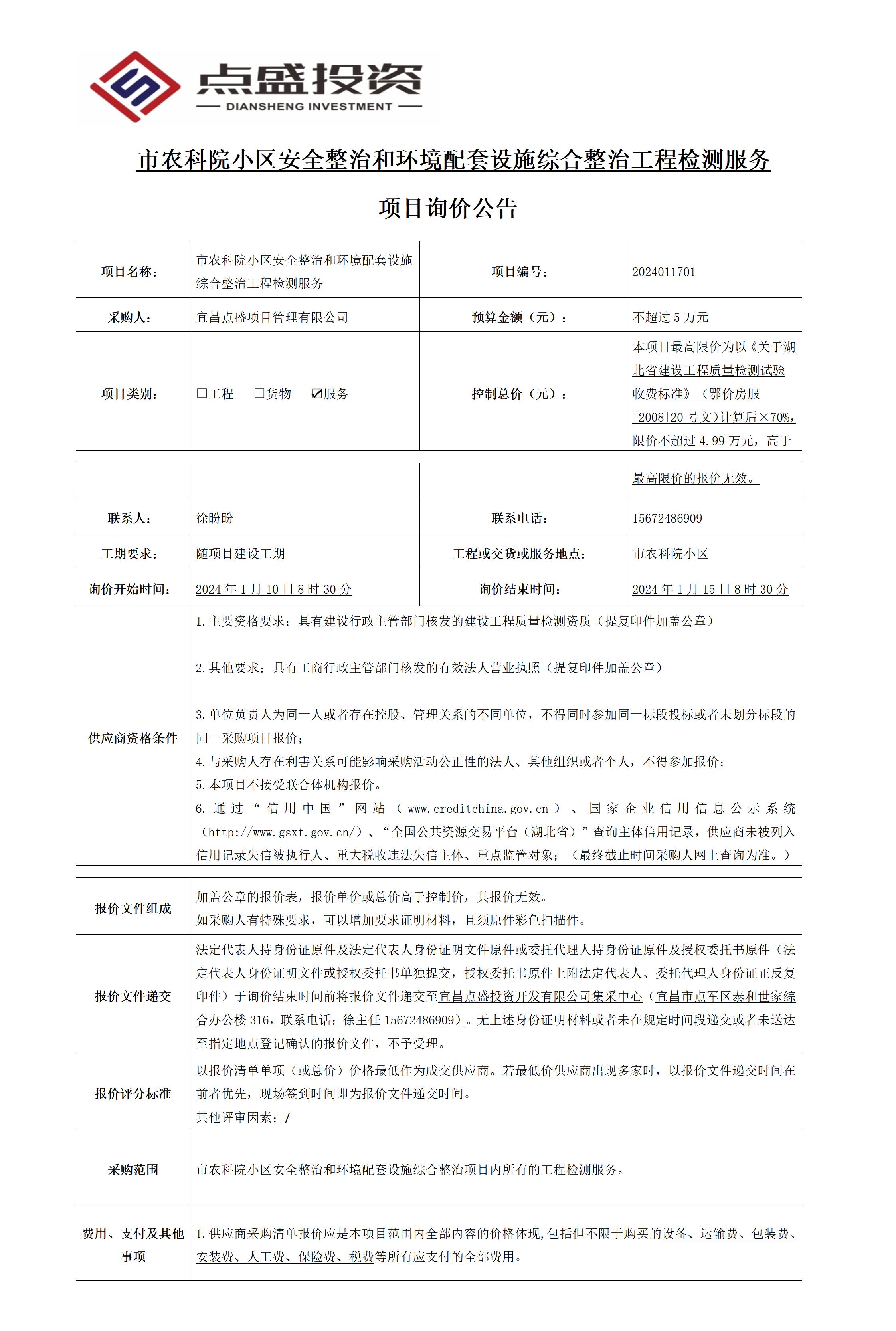 市農(nóng)科院小區(qū)安全整治和環(huán)境配套設施綜合整治工程檢測服務 項目詢價公告